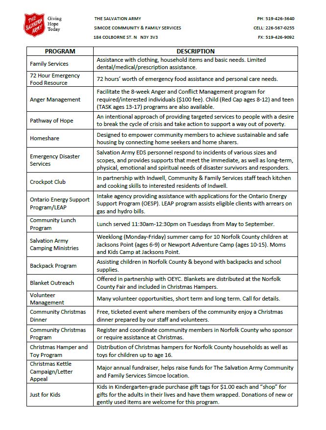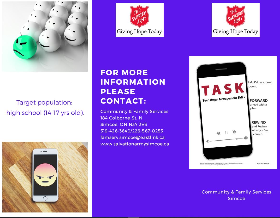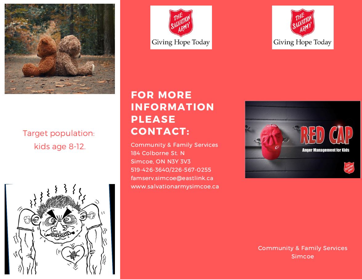 Community Programs Our list of programs is always growing! See the list below for more details: • Family Services Brochure (updated July 2023) • Community Program Descriptions (updated July 2023) • Haldimand & Norfolk Health Unit - Emergency & Low Cost Support (updated Mar. 2023) • Pathway of Hope brochure (updated July 2023) • Red Cap Anger Management (8-12 years) brochure (updated July 2023) • Teen Anger Management sKills (TASK - 14-17 years) brochure (updated July 2023) • Conflict & Anger Management (18+ years) brochure (updated July 2023) For more information on any of the above community programs, please call Family Services at (519) 426-3640 or e-mail simcoe.cfs@salvationarmy.ca.